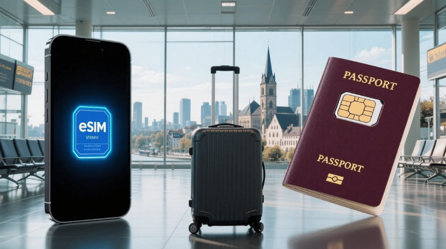 Your flight lands at Findel Airport while cold rain falls outside and the plane is still slowing down on the 4,000-meter runway. There is no need to unbuckle in a rush. Open the mobile network settings on your phone and switch on the pre-installed virtual SIM. In about 8 seconds, the 4G icon appears at the top of the screen, followed almost immediately by a Booking.com message with the check-in code for your hotel at 18 Avenue Royale.