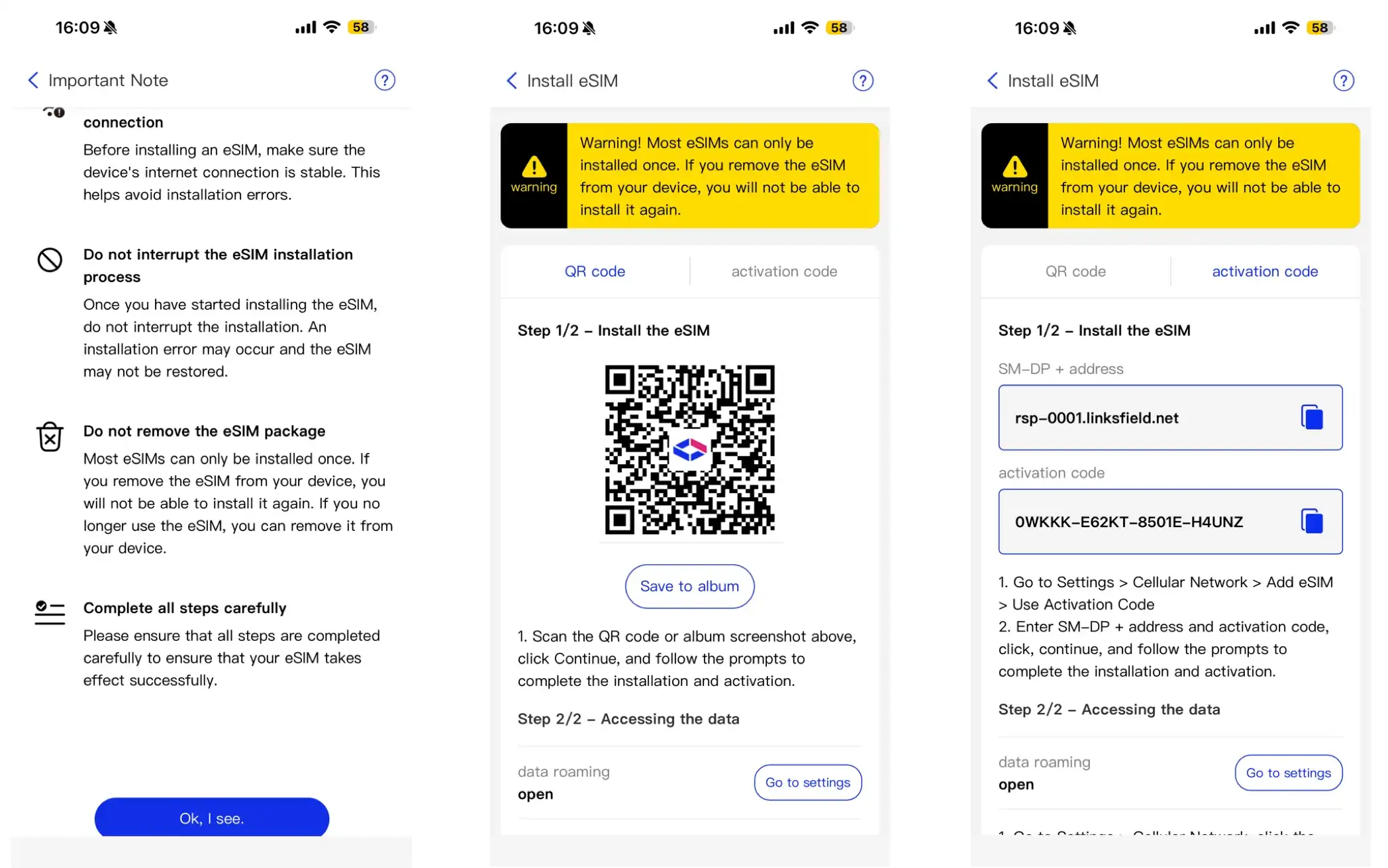2. Click "Install eSIM." You'll be prompted to review important instructions. After confirming, the page will display detailed instructions for both QR code installation and activation code installation.