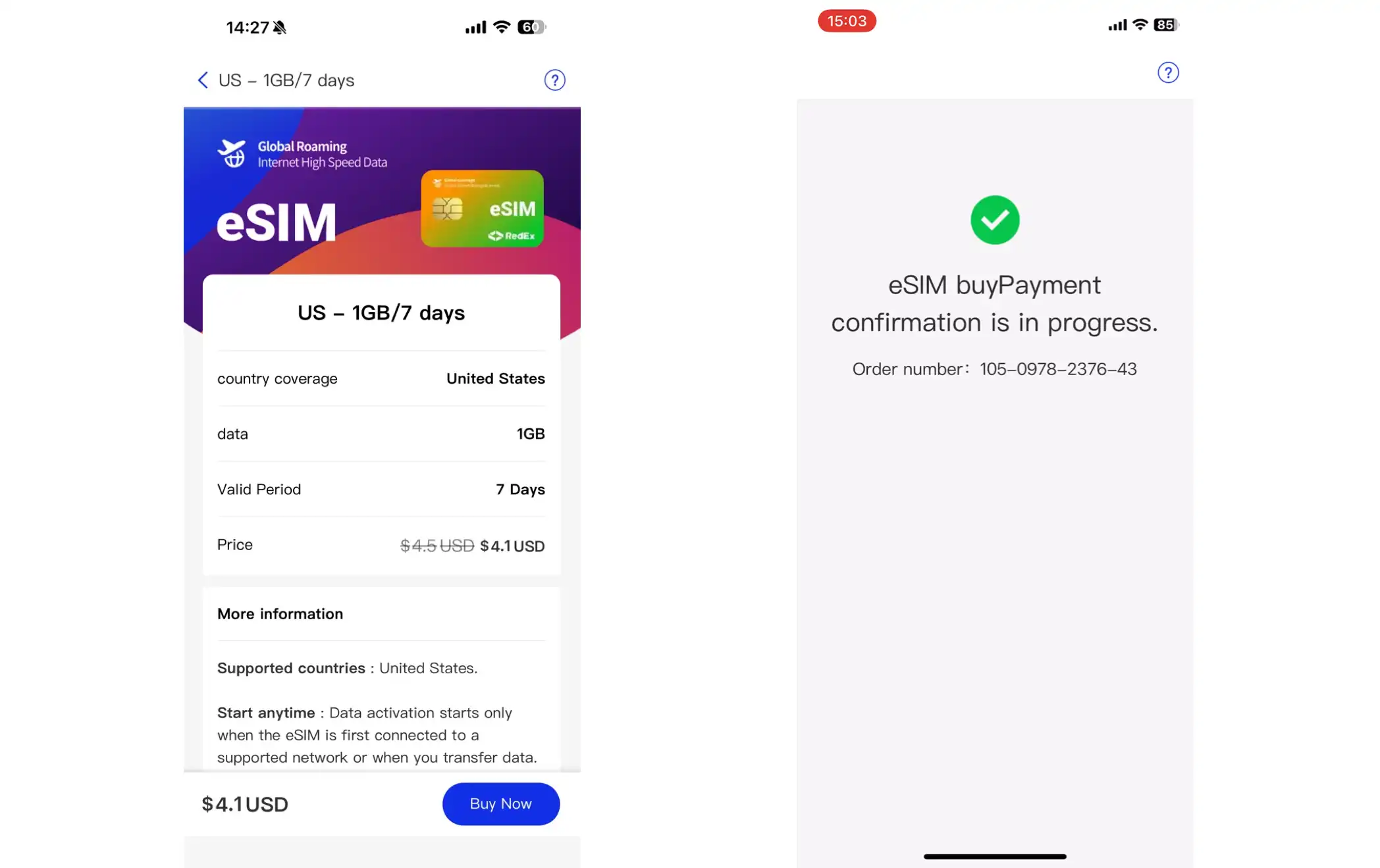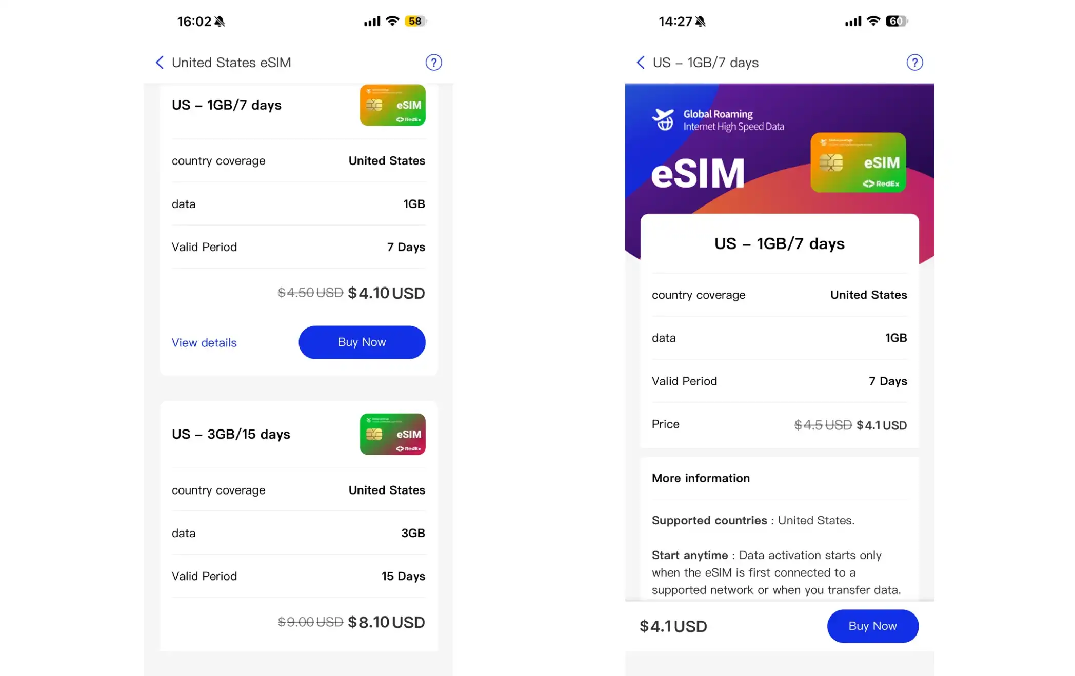 3. Select the eSIM plan you need and click "Buy Now".