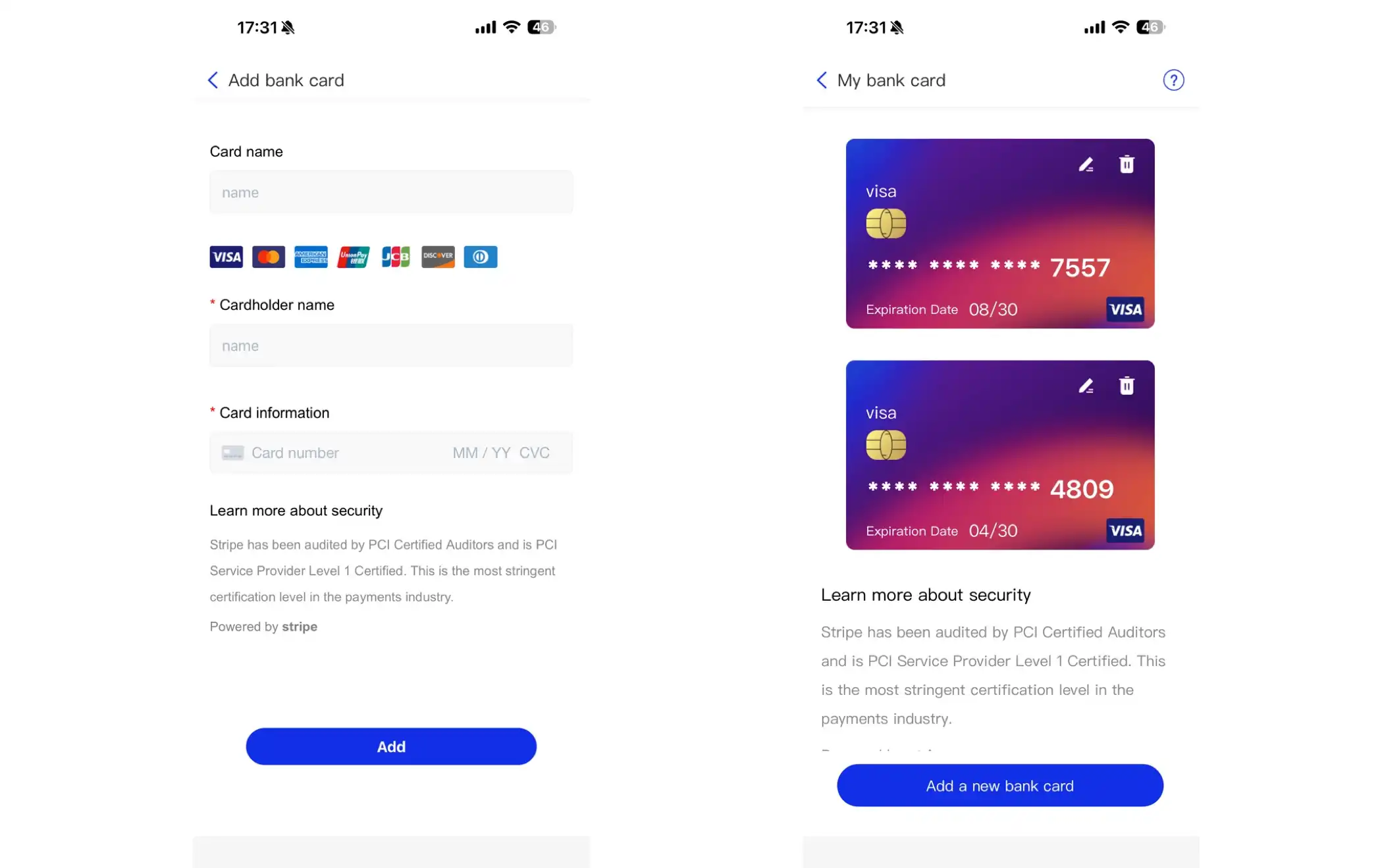 4. Select a payment method. Credit/debit card and PayPal are supported. If you choose to pay by bank card, you'll need to add your bank card first (you can link multiple cards to one account). When adding a new bank card, ensure you enter the correct card information (card number, expiration date, and CVC security code). Otherwise, the payment will fail.