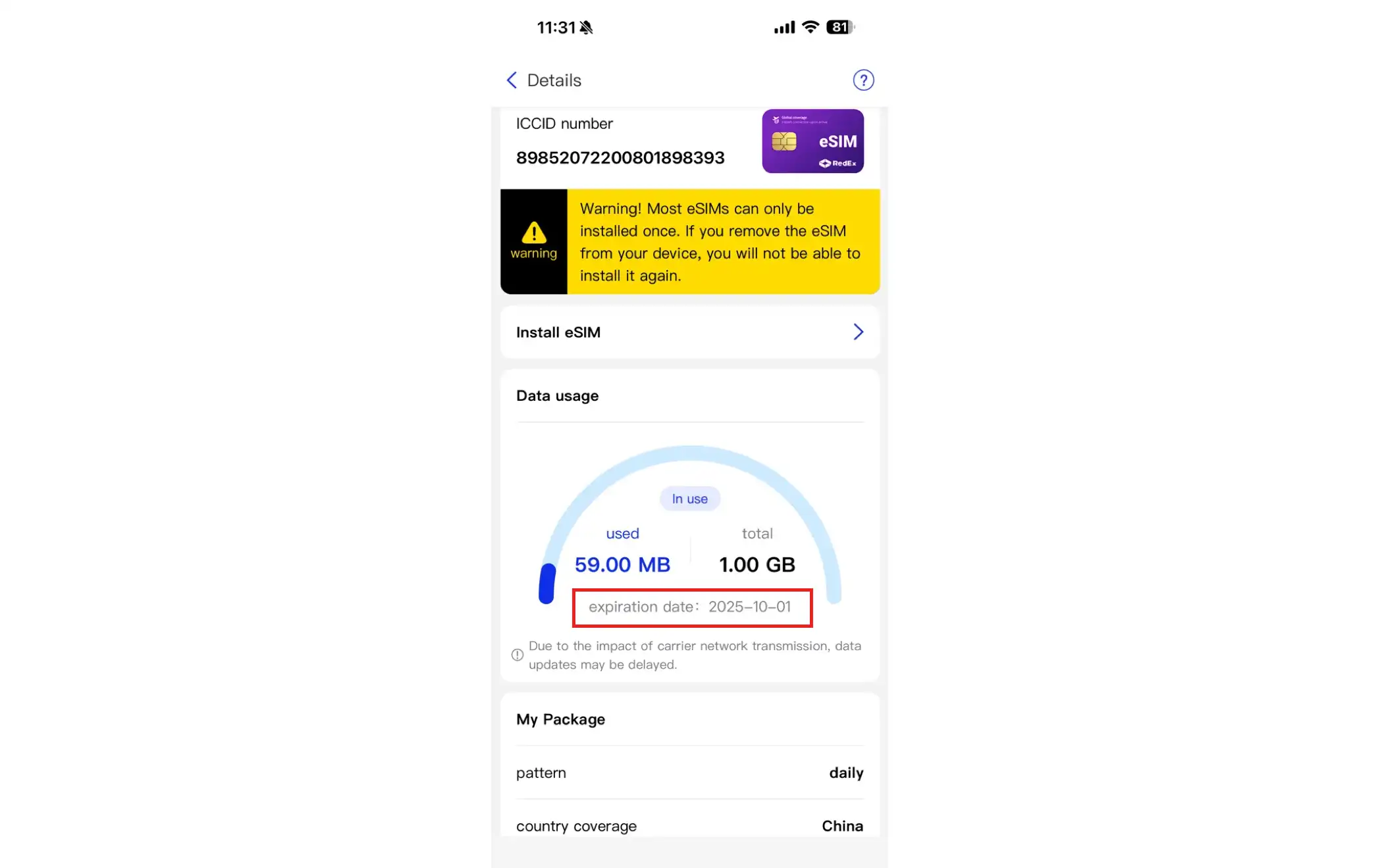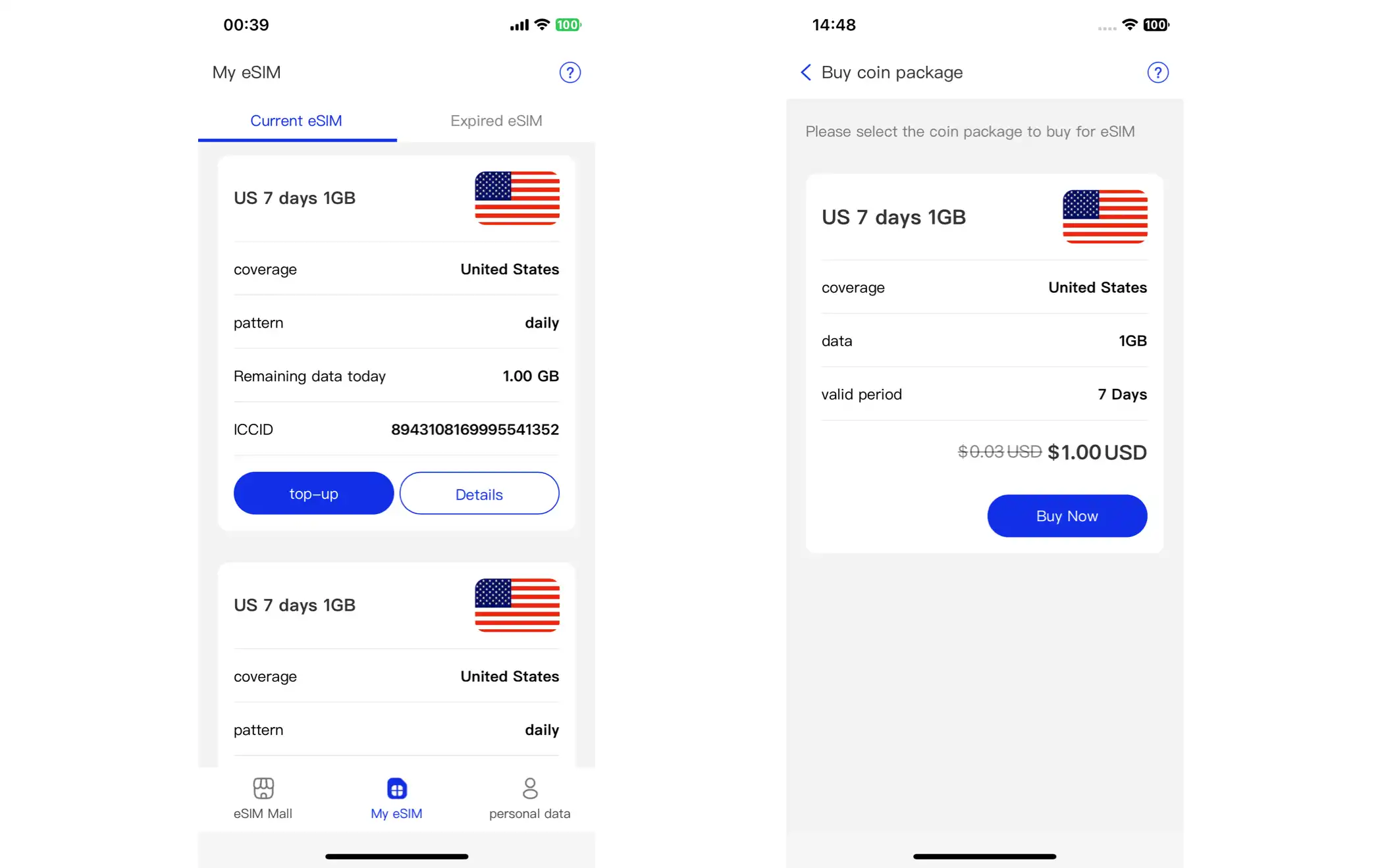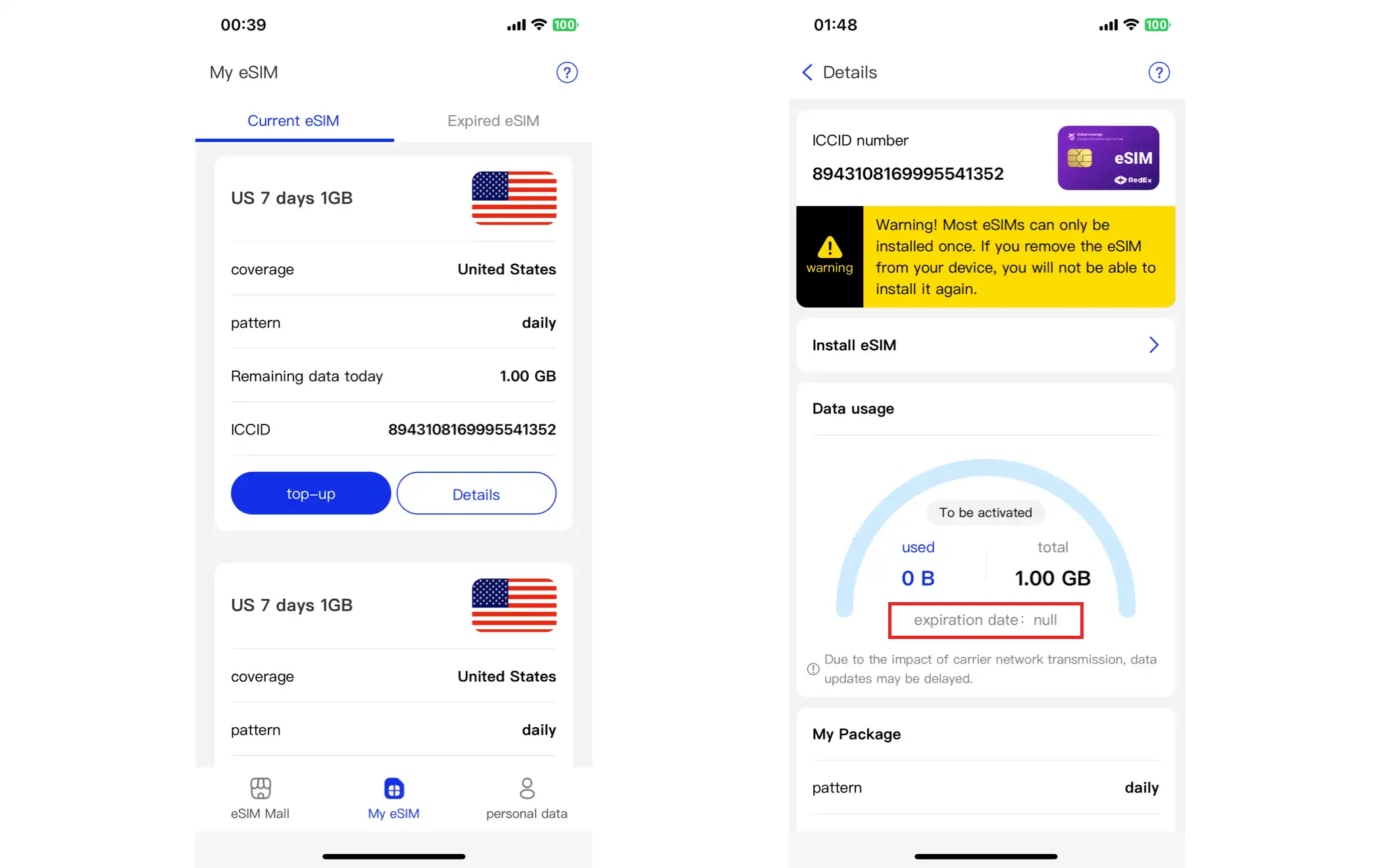 3. After the purchase is complete, go to "My eSIM" -> "Current eSIM" -> "Details" page. The "Package Expiration Date" will be updated based on the top-up status.