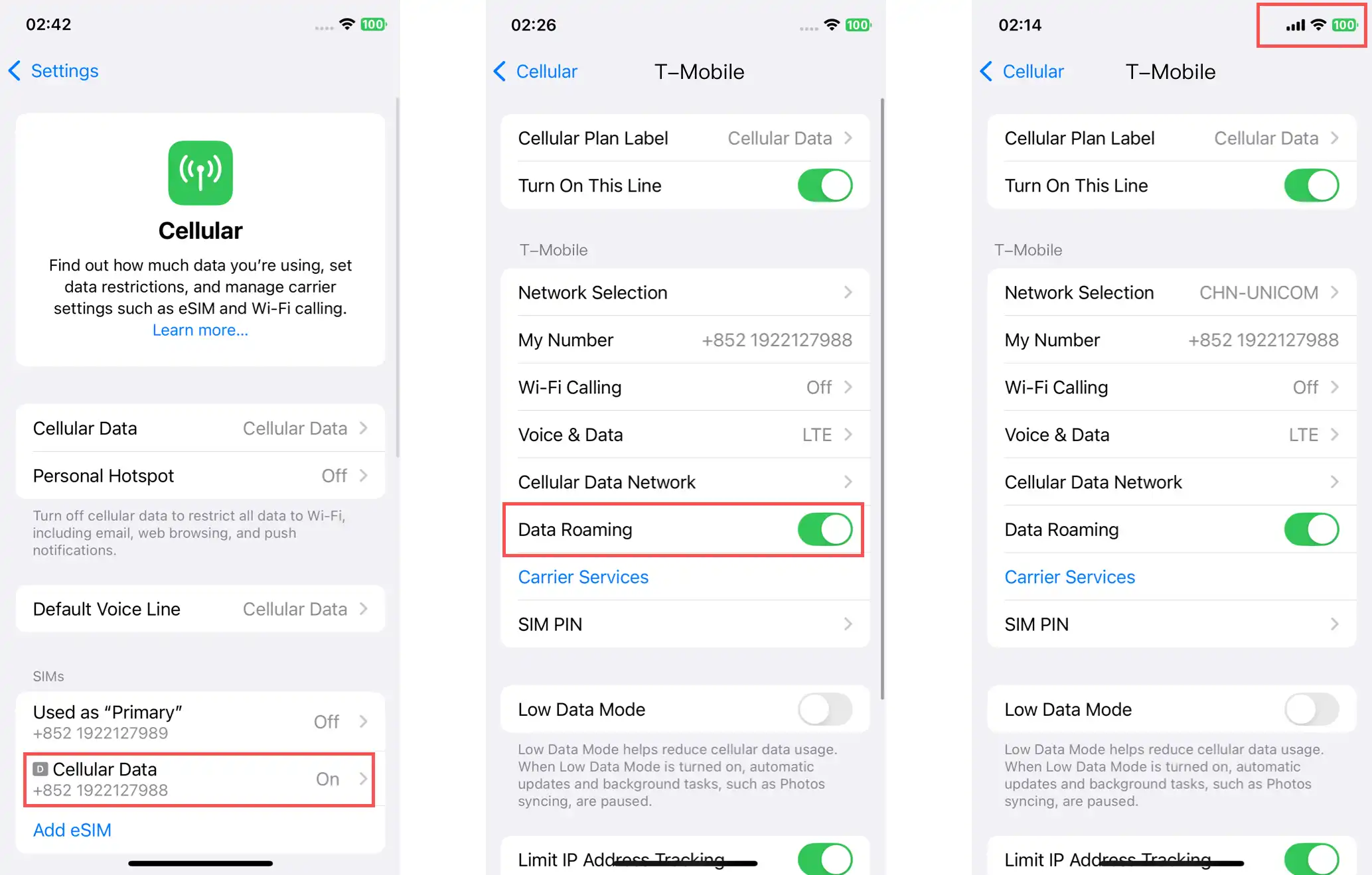 3. After clicking "Done," you'll return to the "Cellular Network" settings screen, where the newly added eSIM card will be displayed as activated. Click it to access its details page and enable "Data Roaming." Your device will then be able to connect to the internet normally.
