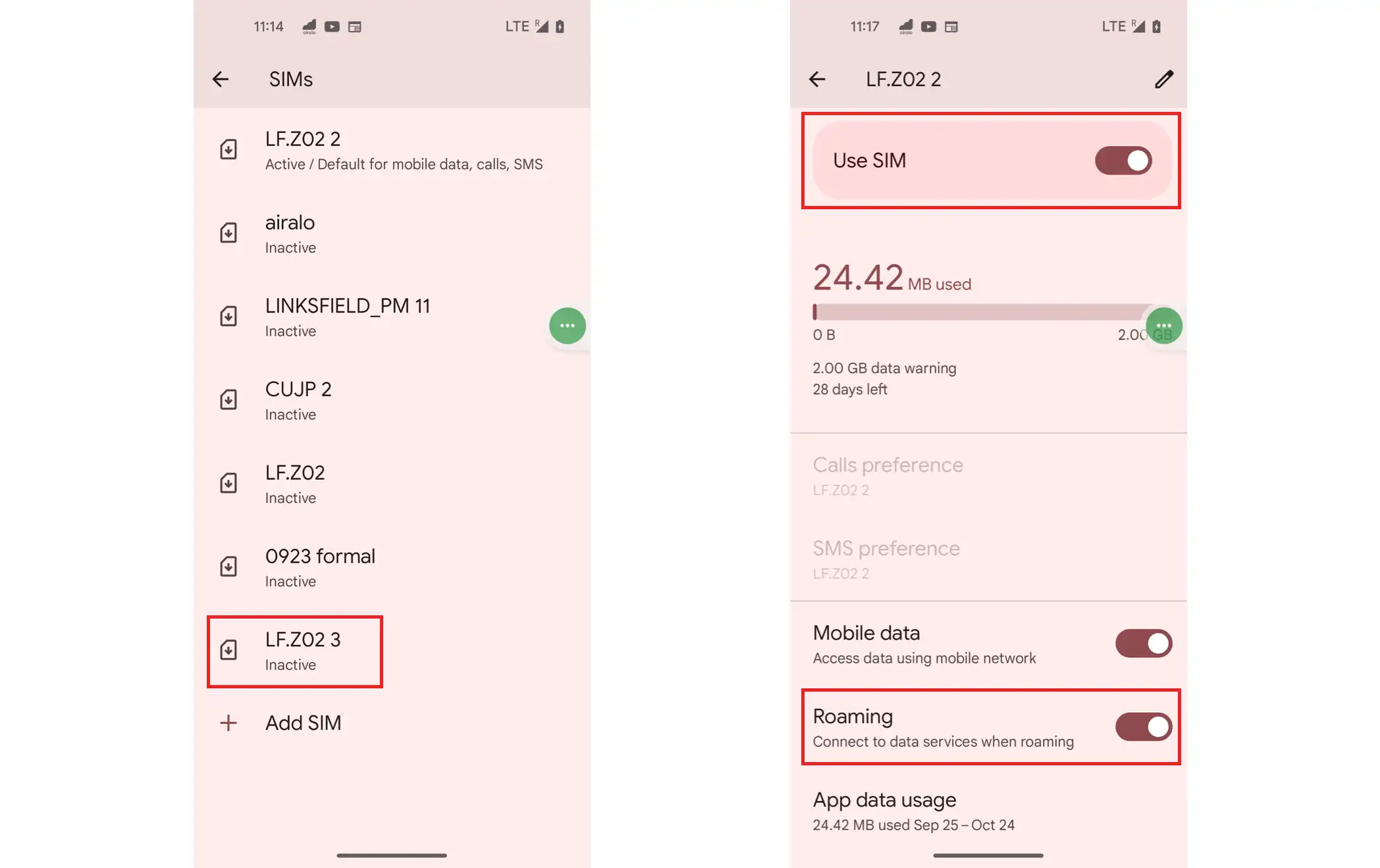 4. Click "Settings" to access the SIM card list on your phone. Select the added eSIM card to access the SIM card settings page. Turn on the "Use SIM Card" option and enable "Data Roaming" to successfully activate the eSIM card.