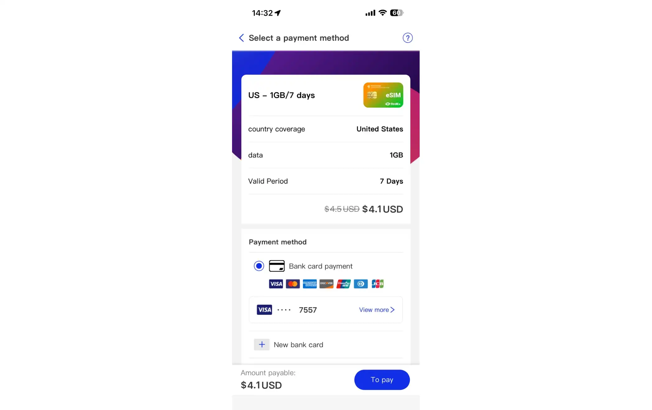 5. After selecting your payment method, click "Pay." Your purchase is successful when you see the confirmation prompt. After the purchase is complete, click "View eSIM" to view detailed information about your purchased eSIM card.